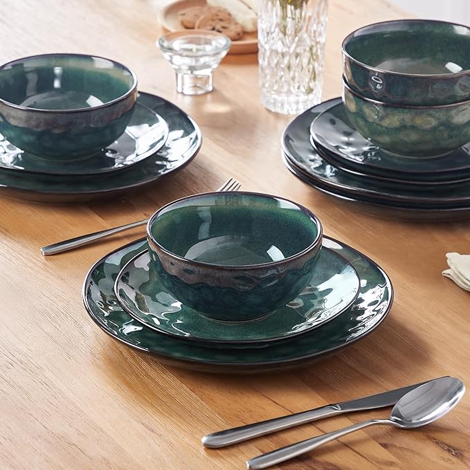 vancasso Starry Dinnerware Set for 4, Handmade Reactive Glaze Stoneware 12 Pieces Plates and Bowls Sets, Dishwasher and Microwave Safe Dish Set, Green