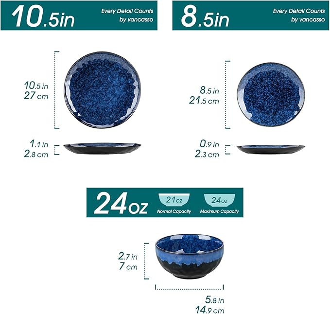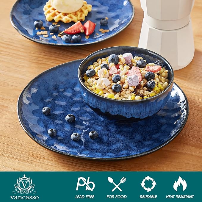 vancasso Starry Dinnerware Set for 4, Handmade Reactive Glaze Stoneware 12 Pieces Plates and Bowls Sets, Dishwasher and Microwave Safe Dish Set, Blue