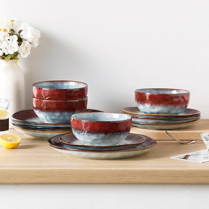 vancasso Starry Dinnerware Set for 4, Handmade Reactive Glaze Stoneware 12 Pieces Plates and Bowls Sets, Dishwasher and Microwave Safe Dish Set, Red