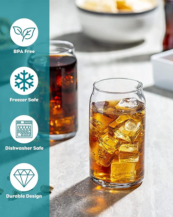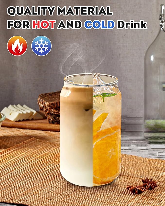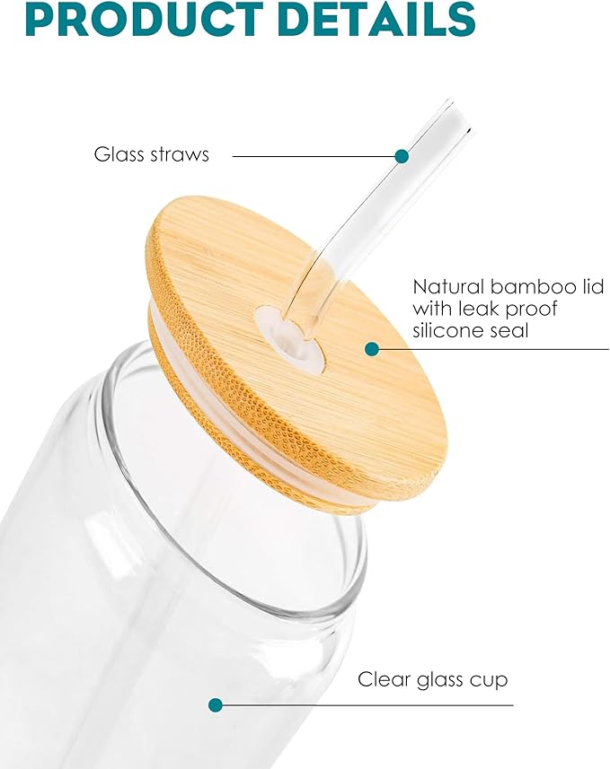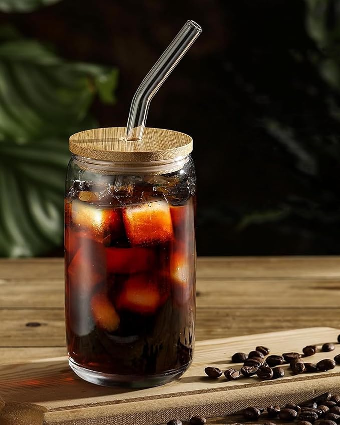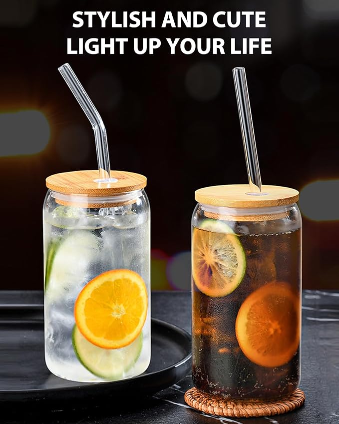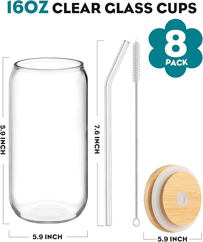 Drinking Glasses with Bamboo Lids and Glass Straw 8PCS Set, 16oz Glass Cups with Lids and Straws, Beer, Iced Coffee Glasses, Soda, Gift 2 Cleaning Brushes