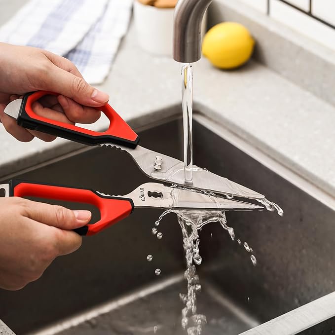 About This Multi-Functional Design: These kitchen scissors feature micro-serrated edges for cutting meats and vegetables along with bottle opener tabs... Read more