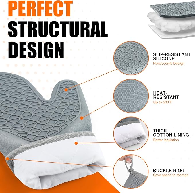 Silicone Oven Mitts, Heat Resistant 2PCS Oven Mitts with Soft Cotton Lining, Waterproof Non-Slip Grip Oven Glove, Kitchen Potholder Mits for BBQ, Baking, Cooking, 12.5 Inch - Grey