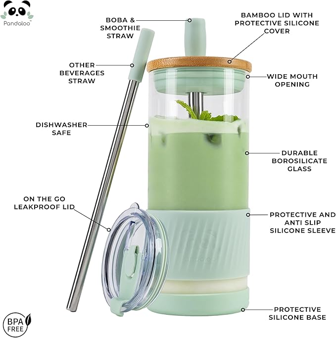 Pandaloo® Glass Cups With Lids and Straws -20 Fl Oz- Perfect Size Iced Coffee Cup - Smoothie Cup With Bamboo Lid and On the go Lid (Sweet Sage, 1 Count (Pack of 1)