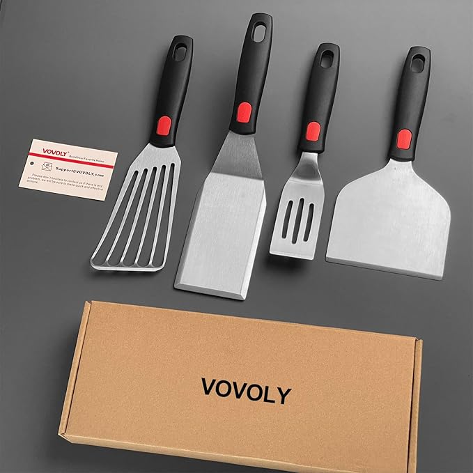 Stainless Steel Spatula Set with Heat Resistant Silicone Handle, VOVOLY Metal Spatulas For Kitchen Use, Thickened Smash Burger Spatula, Mini Brownie Spatula, Fish Flipper, Grill Scraper