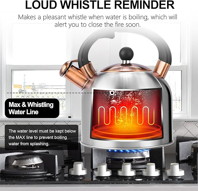 SUSTEAS Tea Kettle - 3.17QT Whistling Kettle with Ergonomic Handle - Premium Stainless Steel Tea Pots for Stove Top, Chic Vintage Teapot with Composite Base, Work for All Stovetops (Silver)
