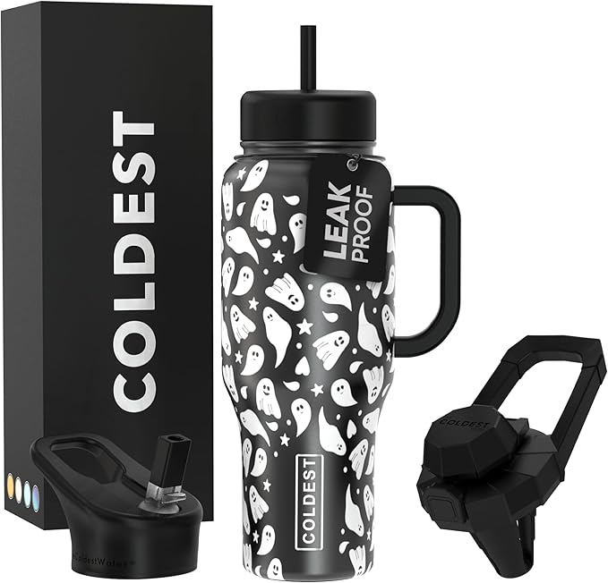 Coldest Tumbler with Handle and Straw - 100% Leak Proof Insulated Tumbler with Lid and Straw (3 Lids) - Stainless Steel Tumblers for Women & Men - Cup Holder Friendly Base, 36 oz (Ghosts)