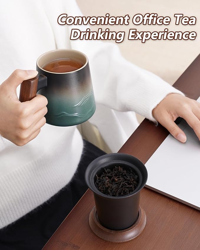 ZENS Embossed Ceramic Tea Mug with Infuser and Lid, 14.5 oz Wooden Handle, Loose Leaf Tea Steeper Cup & Strainer for Tea Lovers Gifts