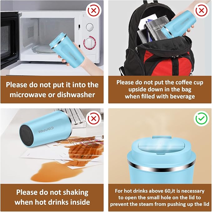 • Use Notes - The coffee cup buckle can be closed tightly after two "clicks",Hand wash only, the dishwasher is not recommended.cannot put in the microwave.