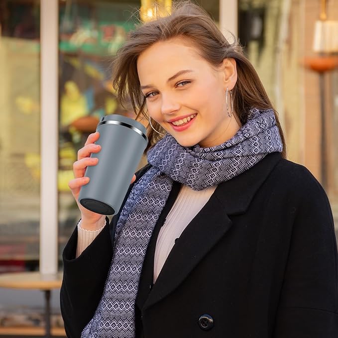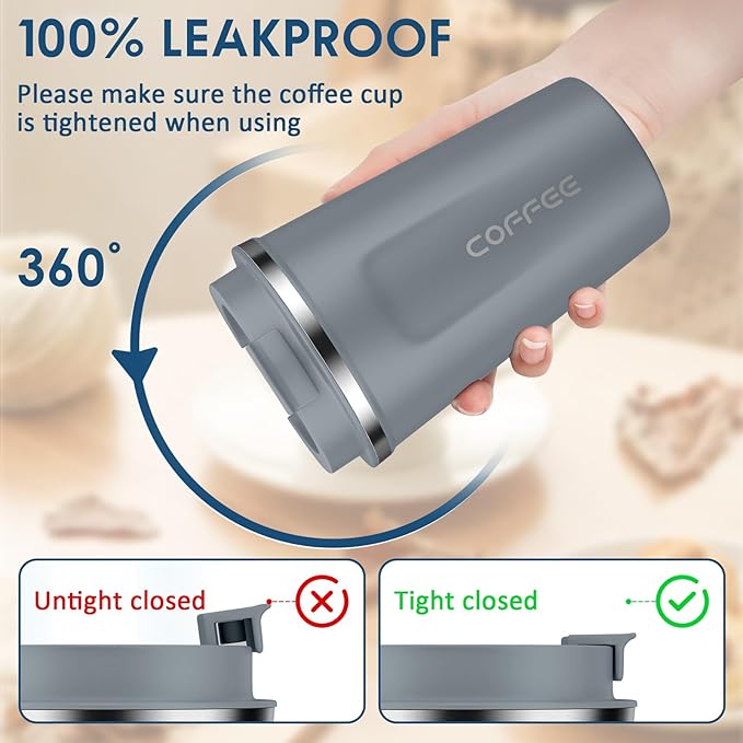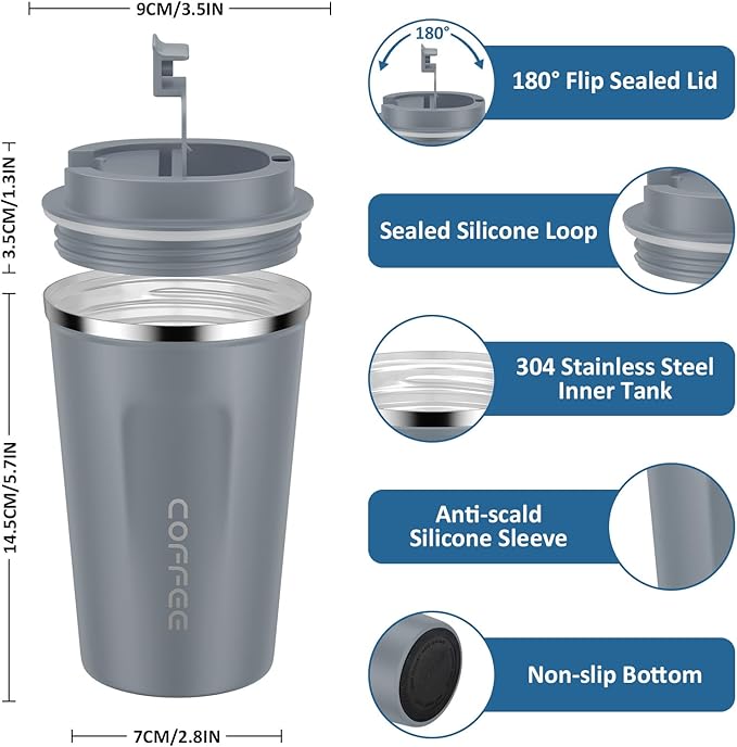 • Leakproof Design - The coffee mug lid comes with an airtight silicone seal that prevents the drinks from spilling. Air Vent on the lid allows beverages to flow out smoothly, without gushing or overflowing.The rubber design at the bottom prevents the cup from slipping or tipping.