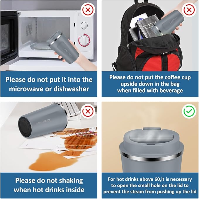 • Use Notes - The coffee cup buckle can be closed tightly after two "clicks",Hand wash only, the dishwasher is not recommended.cannot put in the microwave.
