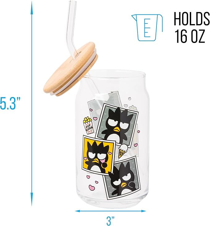 Silver Buffalo Sanrio Hello Kitty and Friends Badtz-Maru Polaroids Glass Jar Tumbler with Bamboo Lid and Glass Straw, 16 Ounces