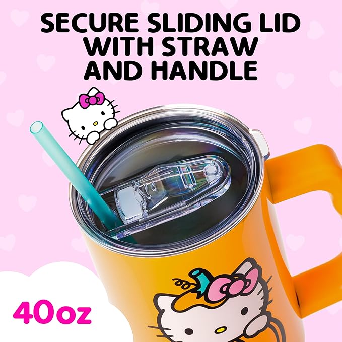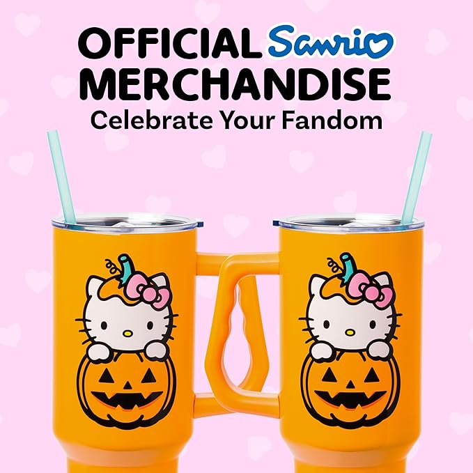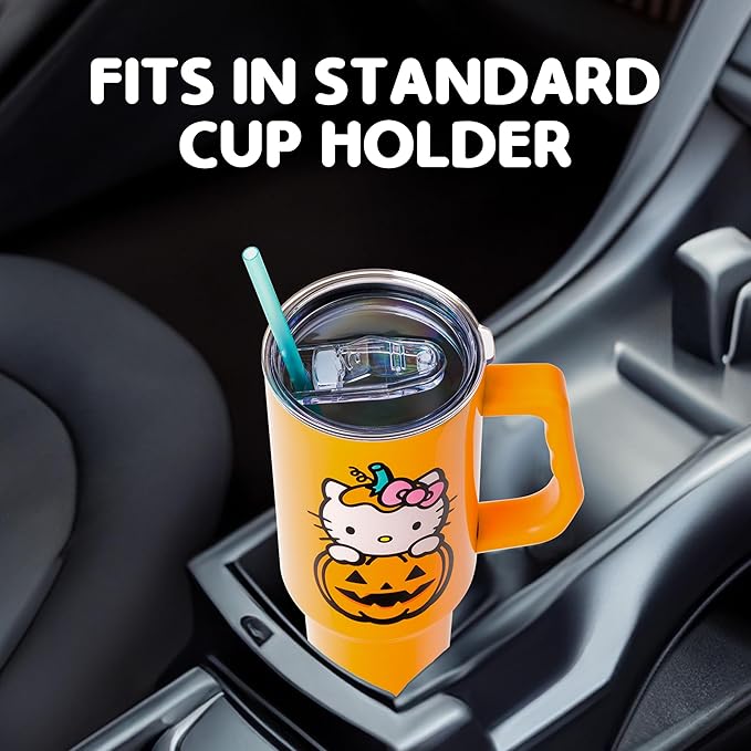 Silver Buffalo Sanrio Hello Kitty Halloween Jack-O-Lantern Stainless Steel Tumbler with Handle and Straw, Fits in Standard Cup Holder, 40 Ounces