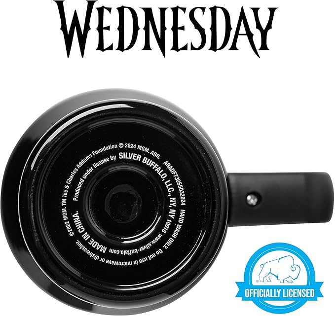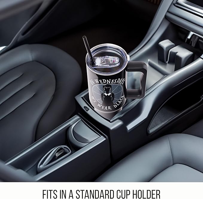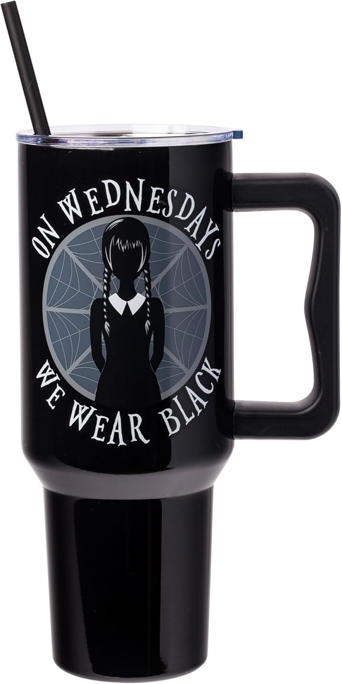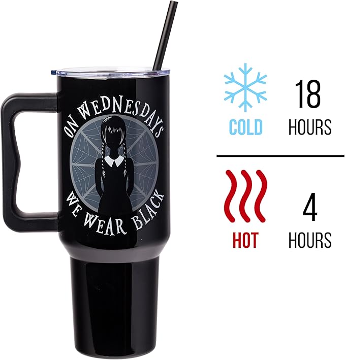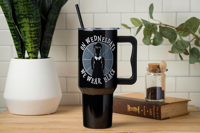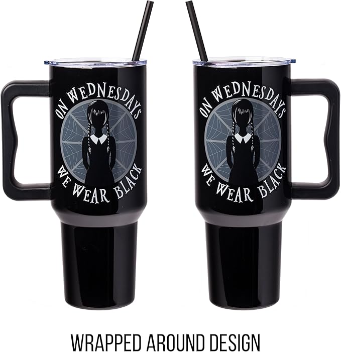 Silver Buffalo The Addams Family Wednesday On Wednesdays We Wear Black Stainless Steel Tumbler with Handle and Straw, Fits in Standard Cup Holder, 40 Ounces