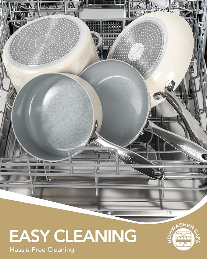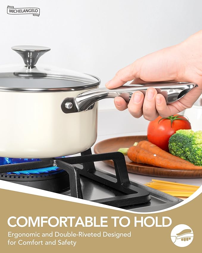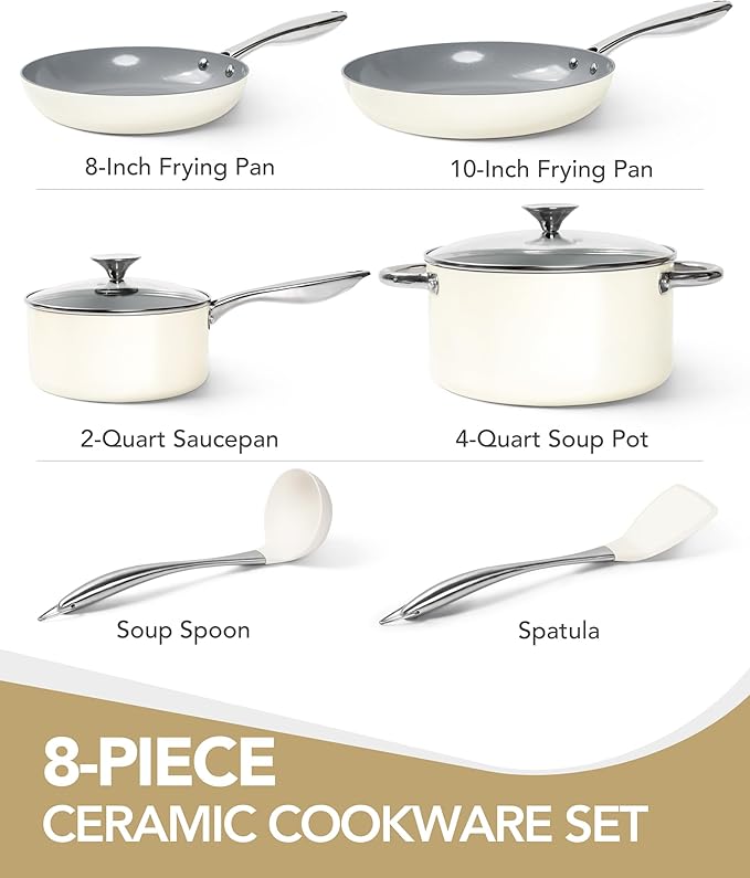 MICHELANGELO Ceramic Pots and Pans Set Non Stick - 8 Pcs Ceramic Cookware Set Non Toxic, Healthy Cooking Set with Ergonomic Handle, Oven Safe & Compatible with All Stovetops - Cream