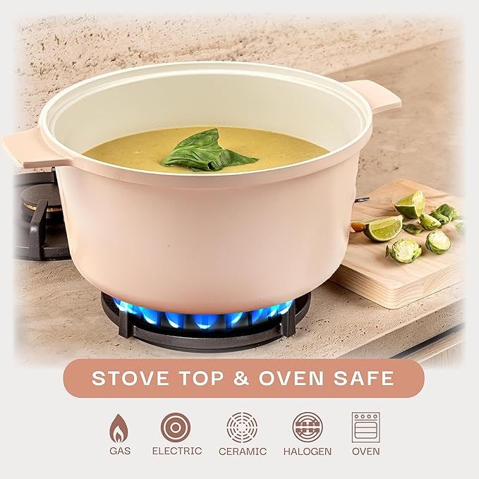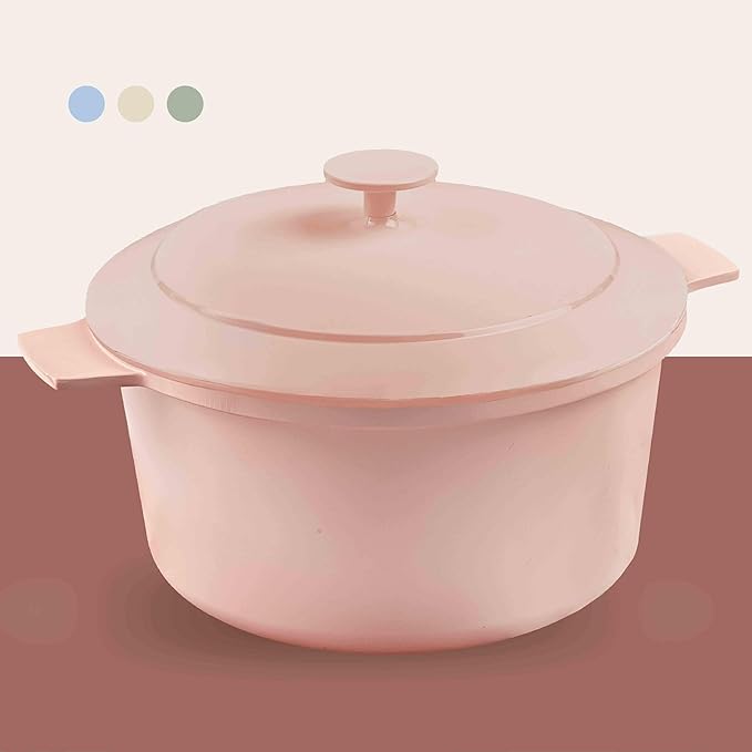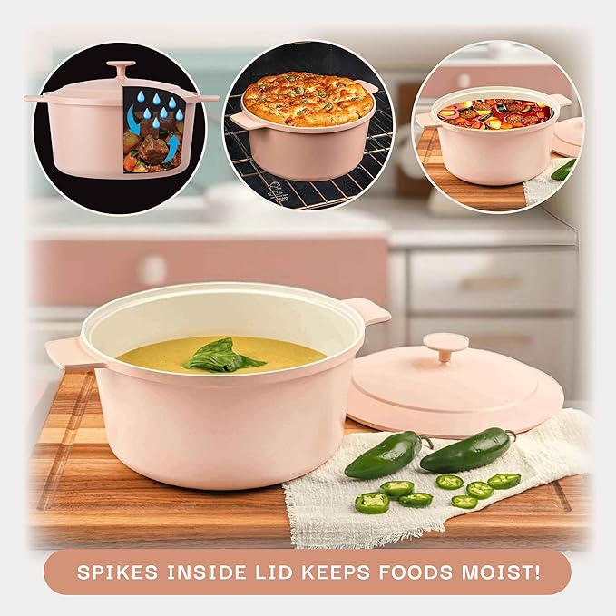 • NON TOXIC: This Ceramic Dutch Oven is free of PFOA, PFOS & other harmful chemicals including lead & cadmium, allowing you and your family to Keep a healthy, toxin free, and ecofriendly cooking environment.