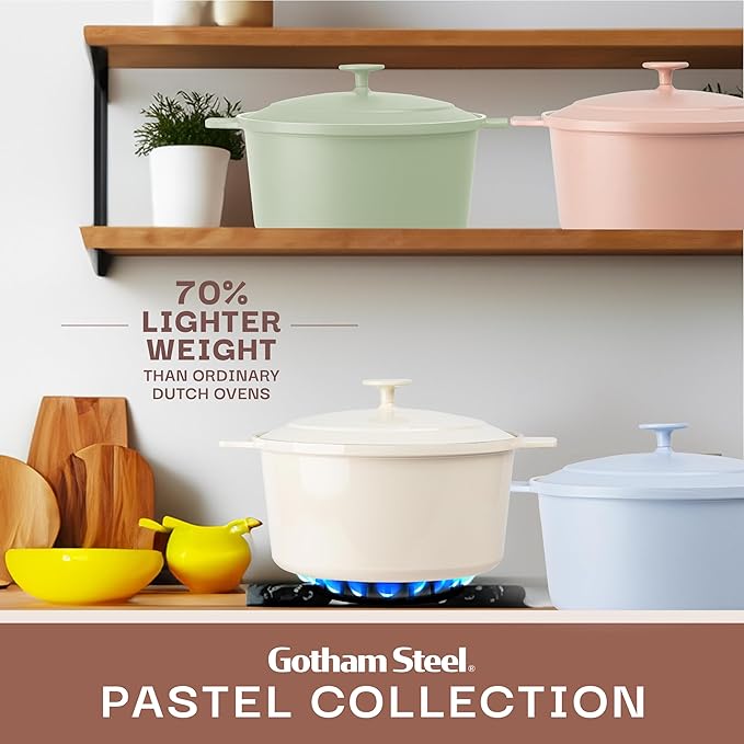 • DUTCH OVEN POT WITH LID: Take your cooking to the next level with the Gotham Steel Pastel Dutch Oven- The innovative lightweight aluminum construction takes modern cooking to the next level with improved performance, style, and durability. Pairing an ultra-nonstick surface with lightweight aluminum, this Dutch Oven Pot is ideal for sourdough bread baking, roasting meat, slow cooking stews and all kitchen tasks for an entire family.