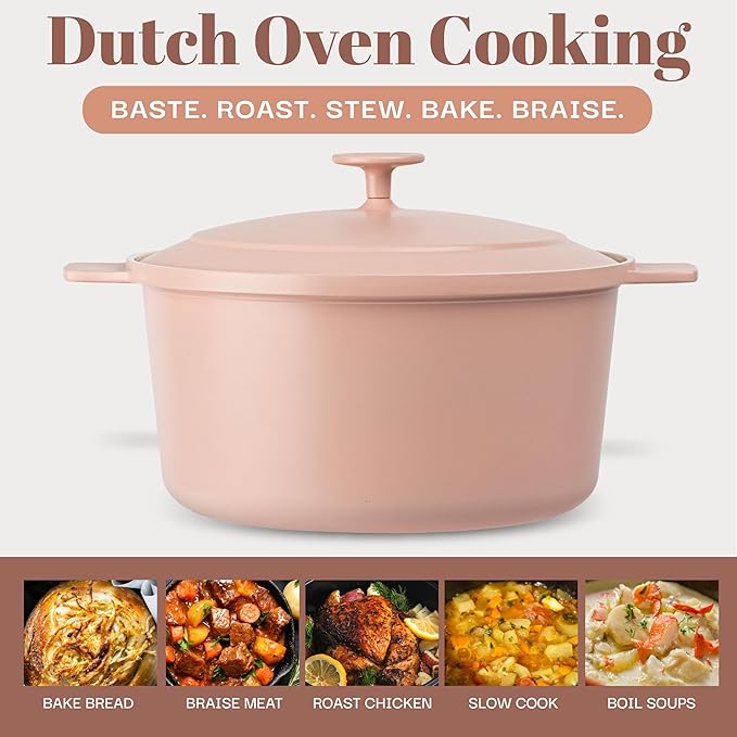 • CERAMIC NONSTICK COATING: Cook healthier meals, get easy food release, and an effortless cleanup with ultra-nonstick ceramic coating. This Dutch Oven is generously coated 3 times and reinforced with diamonds to ensure no foods or liquids stick to the Dutch Oven while cooking or baking, without any oils or butters needed, providing lower calorie meals, easy food release, and quick cleanups.