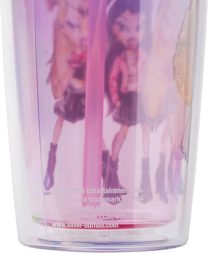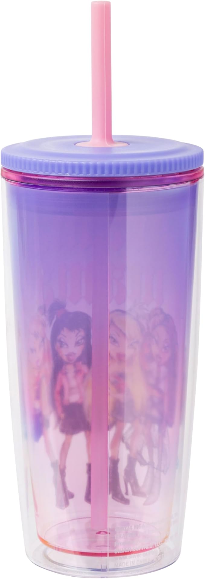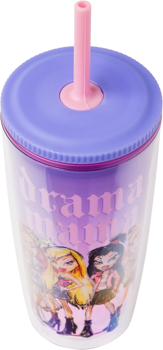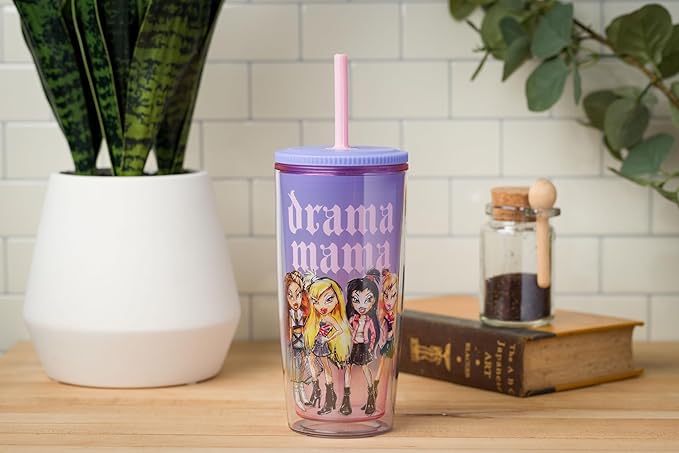 Silver Buffalo Bratz Drama Mama Featuring Cloe, Yasmin, Jade, and Sasha Plastic Tumbler Cold Cup with Lid and Straw, 20 Ounces