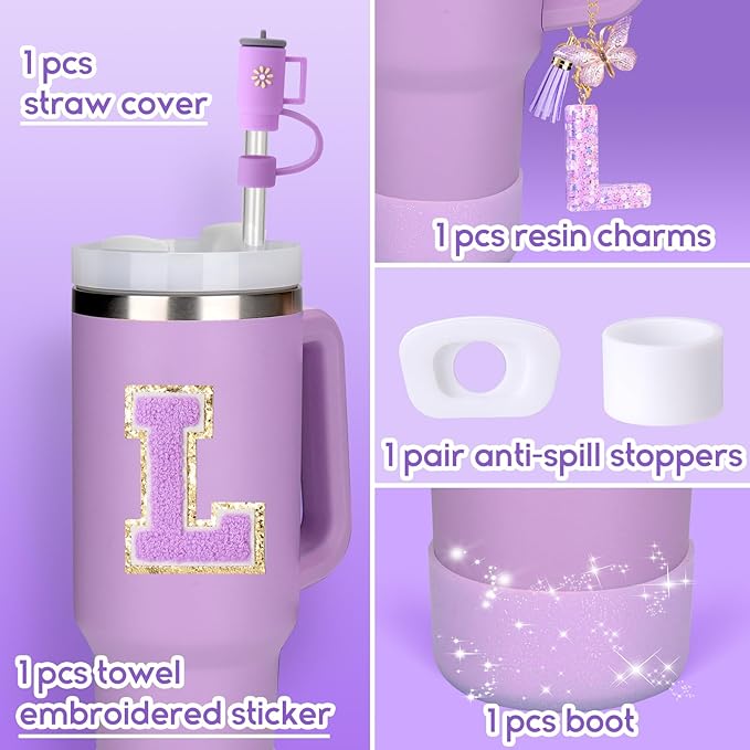 Mity rain 6PCS Cup Accessories Set for Stanley Cup 30oz 40oz tumbler with handle, Including Silicone Straw Topper Cover Cap and Boot, Spill Proof Stopper, Handle Charm, Initials Sticker (Letter L)