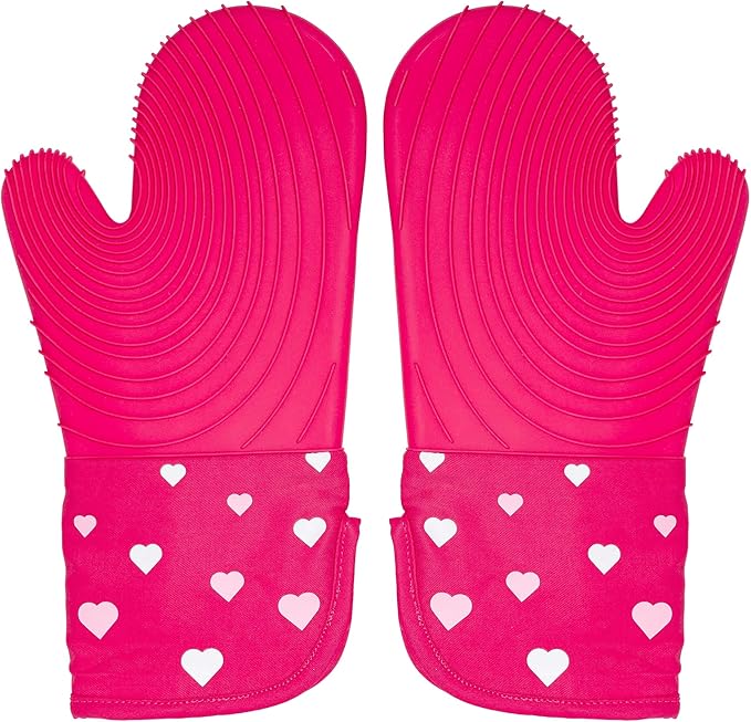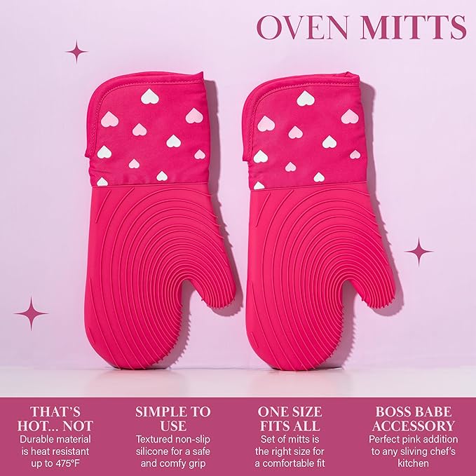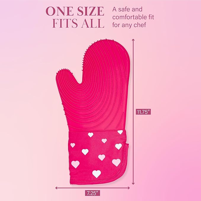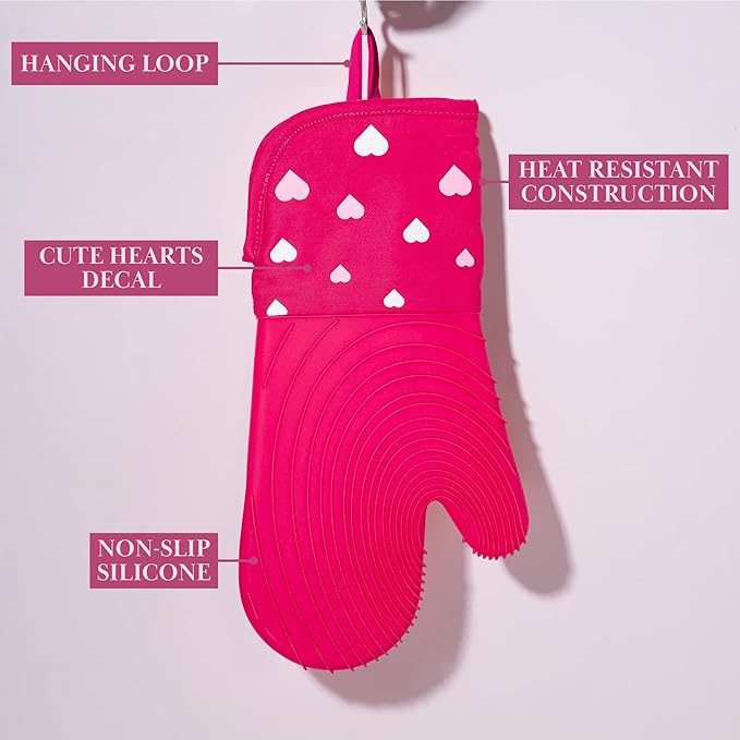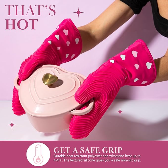 Paris Hilton Oven Mitt Set with Heart Design, Heat Resistant Pot Holders Featuring Non-Slip Textured Silicone Grips, 2-Piece Set, Pink