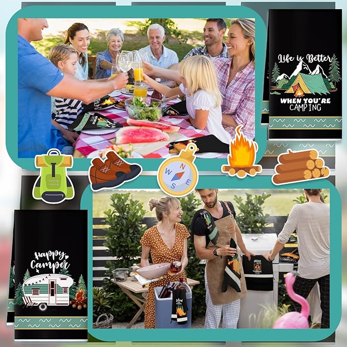 Boyiee 6 Pcs Camping Kitchen Towels Black Absorbent Dish Towels Bonfire Tent Car Tea Towels 24 x 16 Inches with Funny Sayings Novelty Gifts for Campers Happy Camper Camping Accessories for RV Campers