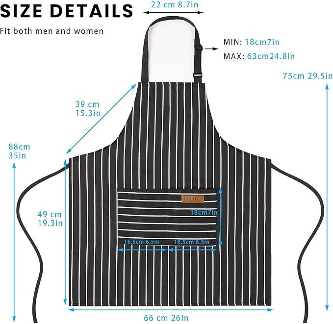 • Adjustable Shoulder Strap: 36"x 27" size Large cooking aprons cover from chest to knee. Our bib apron can adjust the neckline and waistband to the desired size for the most comfortable wearing