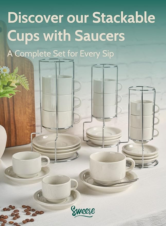 Sweese Porcelain Espresso Cups Set, 2.5 oz, with Saucers, Metal Stand, Stackable - Dove Grey, 4 Pack