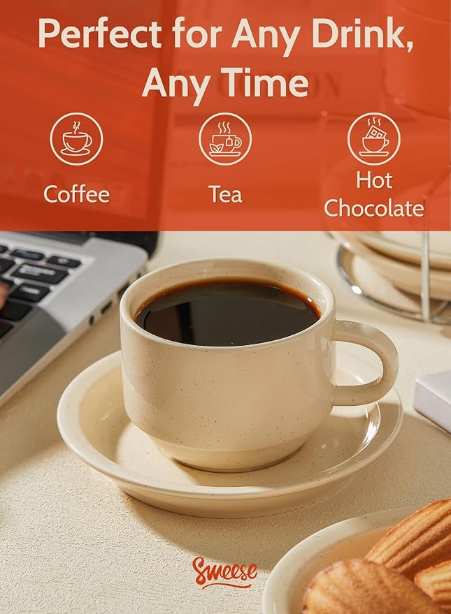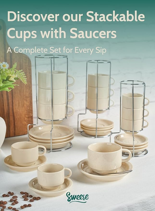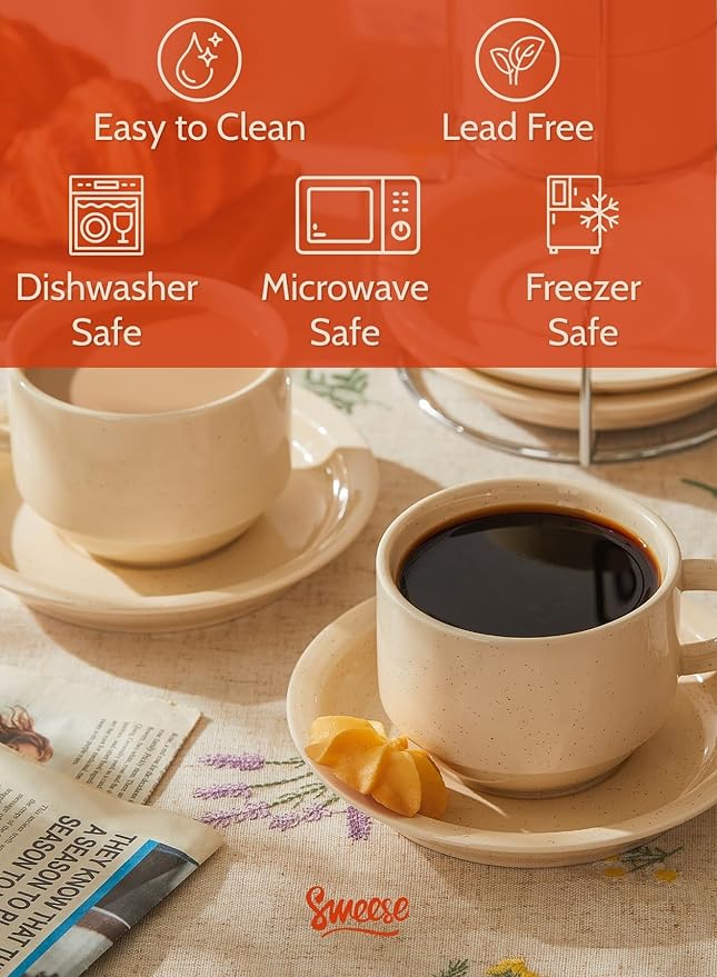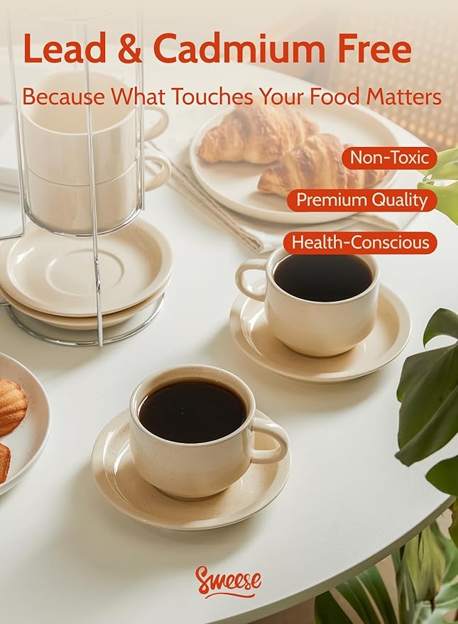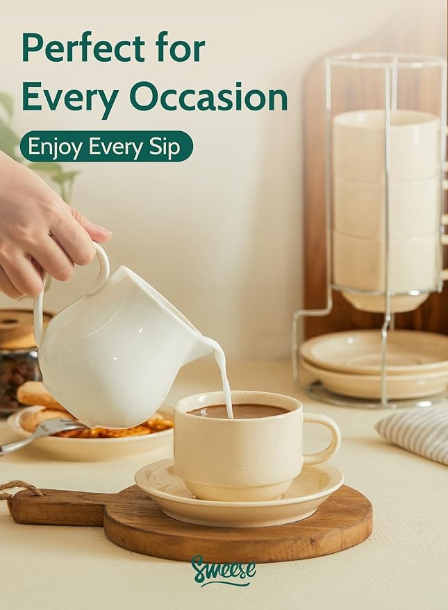 Sweese 8oz Porcelain Cappuccino Cups Set with Saucers, Metal Stand - Stackable, Durable for Coffee, Latte, Tea - Beige, 4 Pack