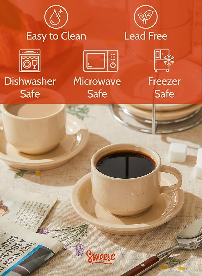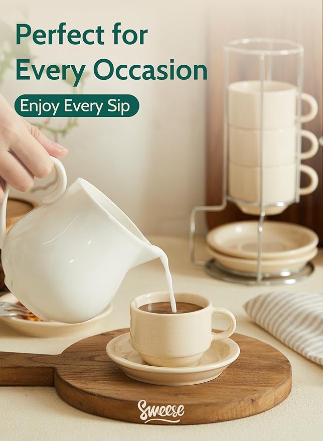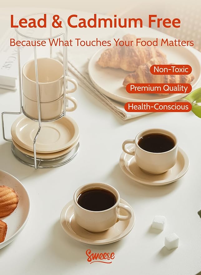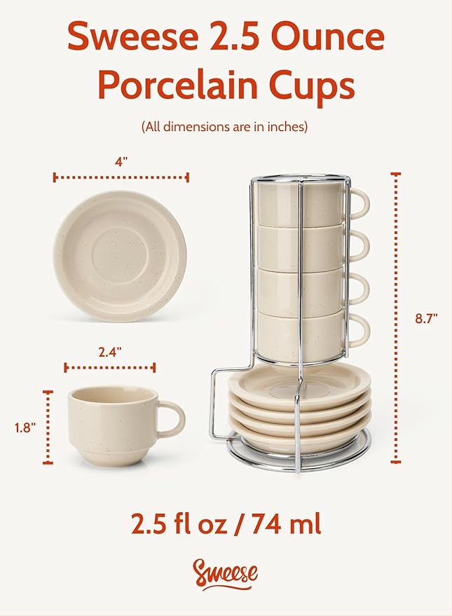 Sweese Porcelain Espresso Cups Set, 2.5 oz, Stackable with Saucers Metal Stand, Beige, 4 Pack