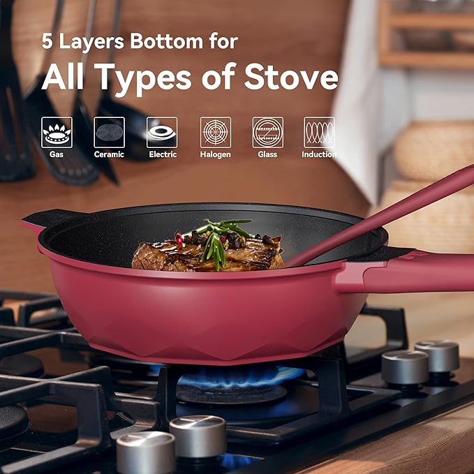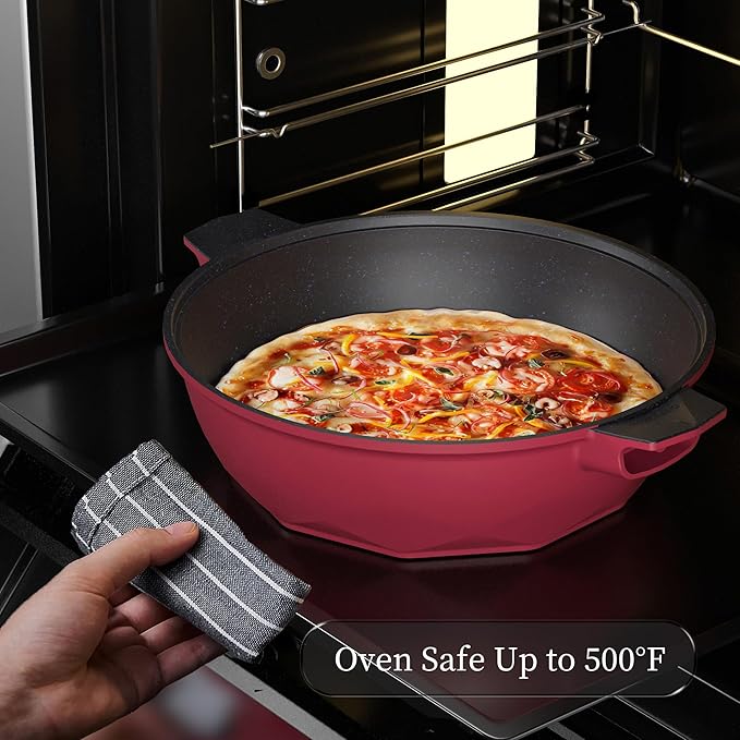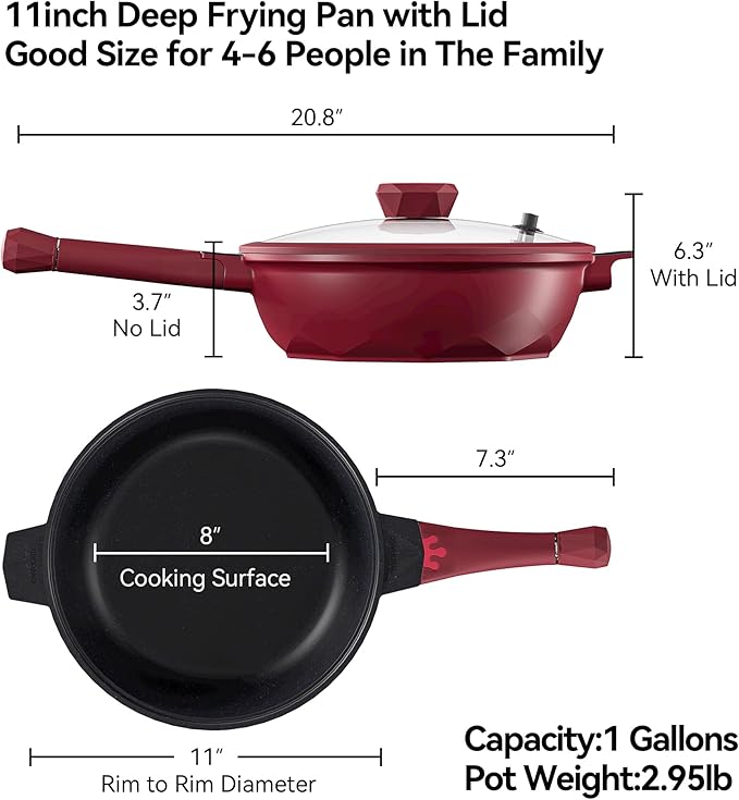 TIBORANG 8 in 1 Multipurpose 11 Inch 5 Quart Heat Indicator Nonstick Deep Frying Pan with Glass Lid,Stay-cool Handle,Steamed Grid,PFOA-Free,Dishwasher&Oven Safe,Works with All Stovetops(Ruby Red)