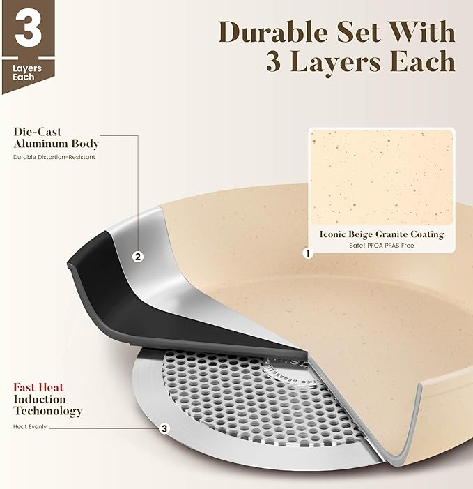 Kitchen Academy Induction Pots and Pans Set Non Stick - 12 Pieces Nonstick Kitchen Cookware Set, Granite Cooking Set Pots and Pans, Beige