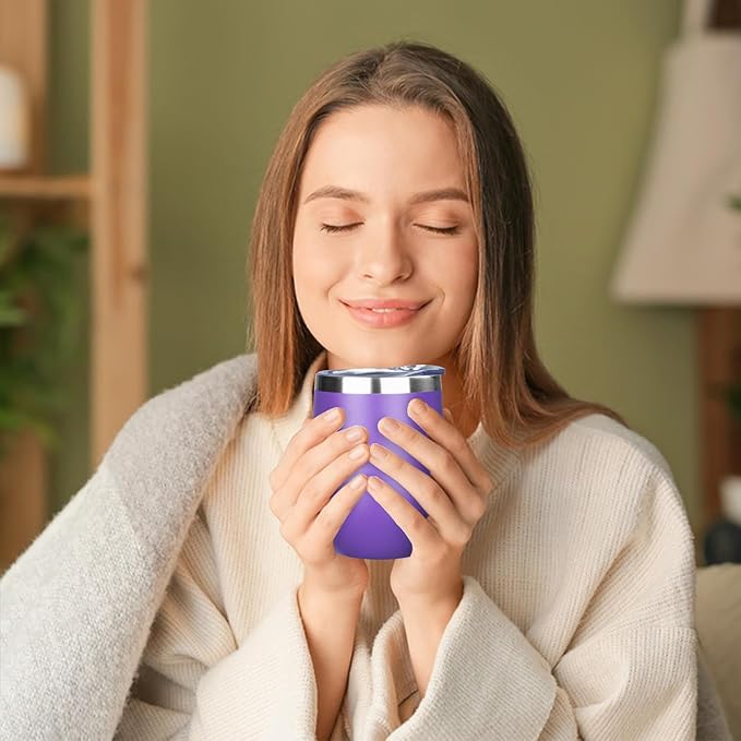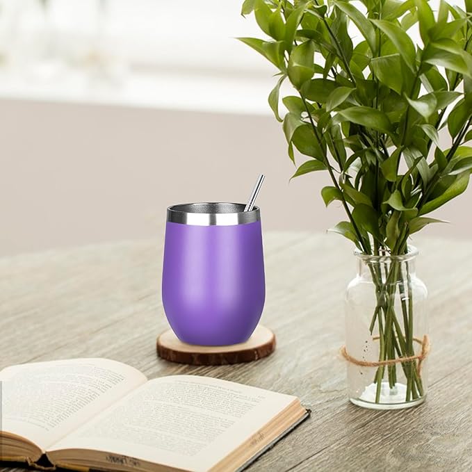 MEZMUT 12 Oz Insulated Wine Tumbler with Lid Double Wall Vacuum Stainless Steel Wine Glass Coffee Mug Insulated Tumbler Cup for Champaign, Cocktail, Beer (Purple, 4 Pack)