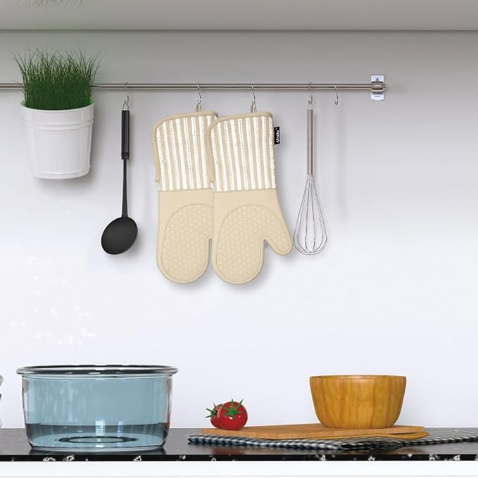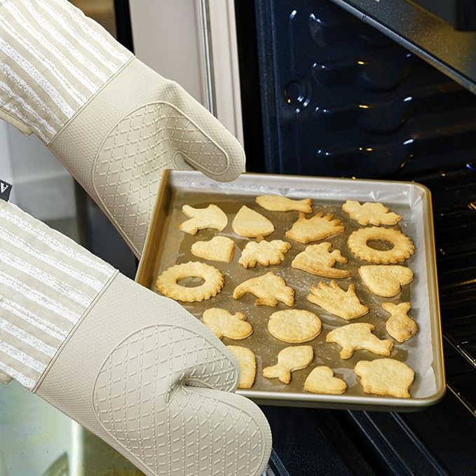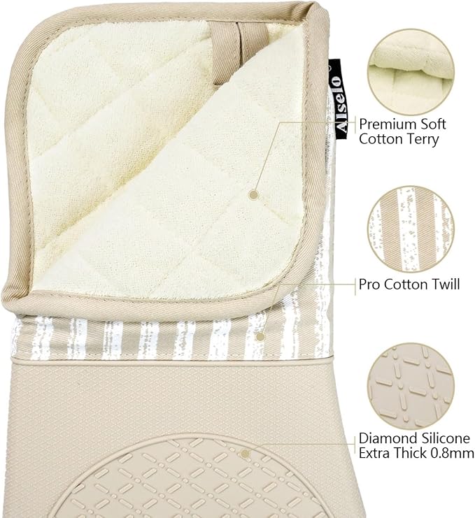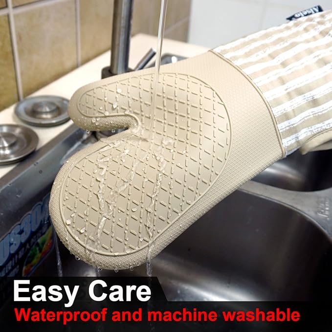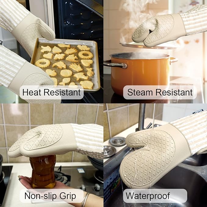 Silicone Oven Mitts Heat Resistant 932℉ with Waterproof & Non-Slip Kitchen Mittens, Set of 2 Extra Long Oven Gloves with Soft Cotton Terry Lining for Baking Cooking Barbecue (Khaki, 2)