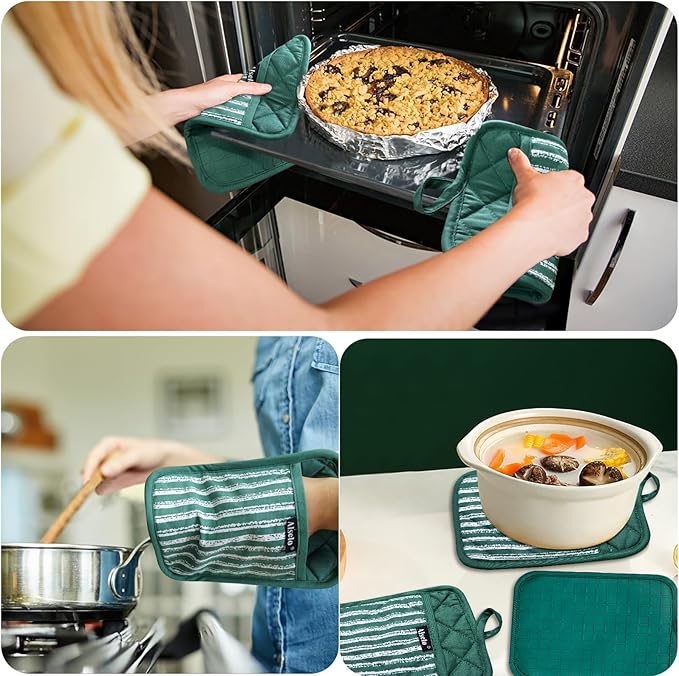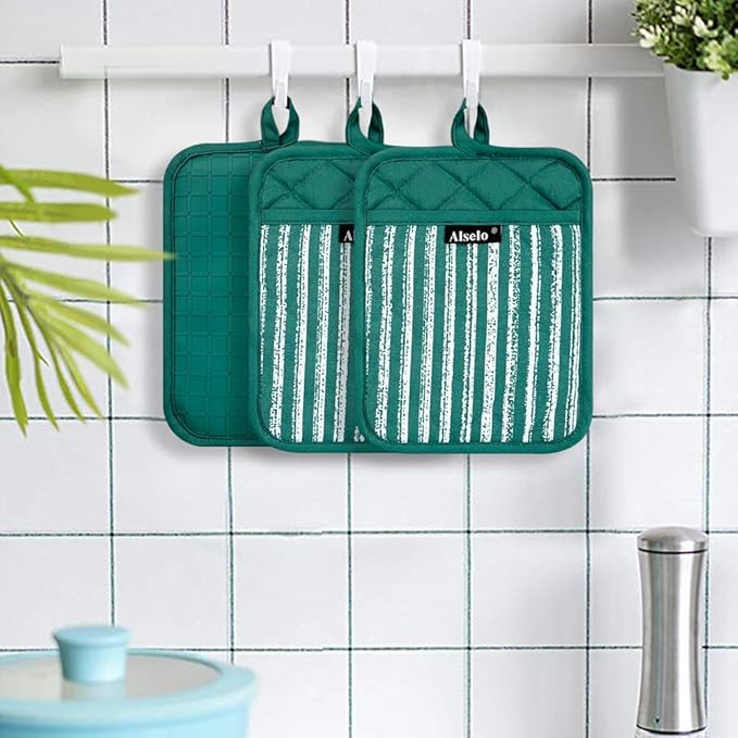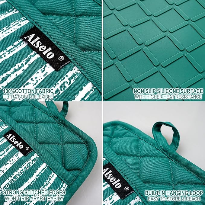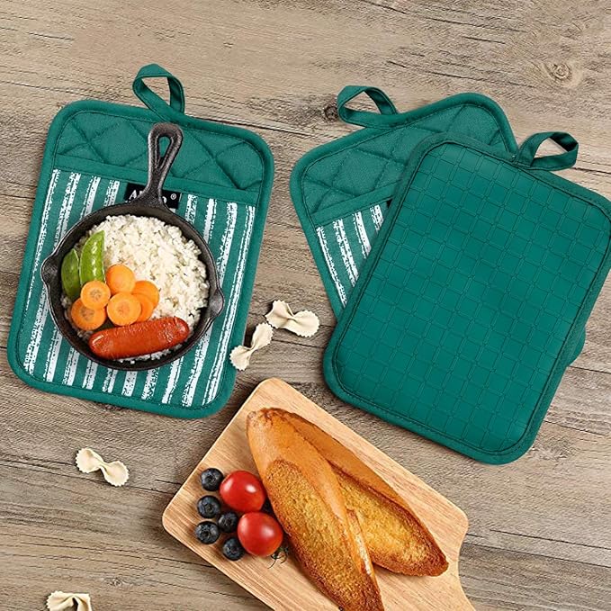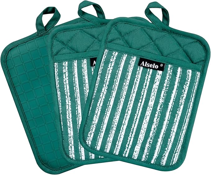 Silicone Pot Holders Set of 3 Heat Resistant & Non Slip Potholders, Professional Oven Hot Pads with Pockets Mitts for Kitchen Cooking Baking Barbecue (Emerald Green, 3)