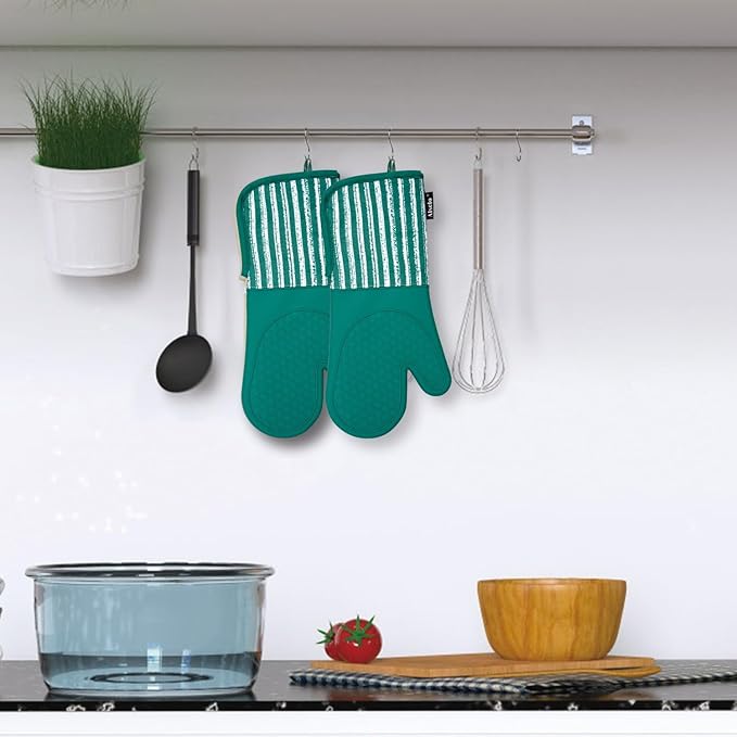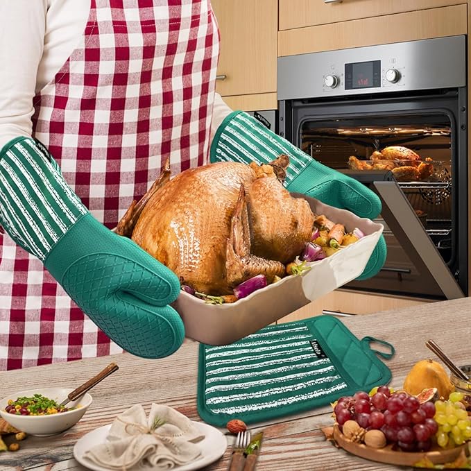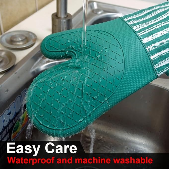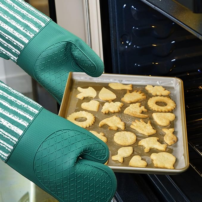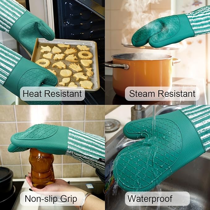 Silicone Oven Mitts Heat Resistant 932℉ with Waterproof & Non-Slip Kitchen Mittens, Set of 2 Extra Long Oven Gloves with Soft Cotton Terry Lining for Baking Cooking Barbecue (Emerald Green, 2)