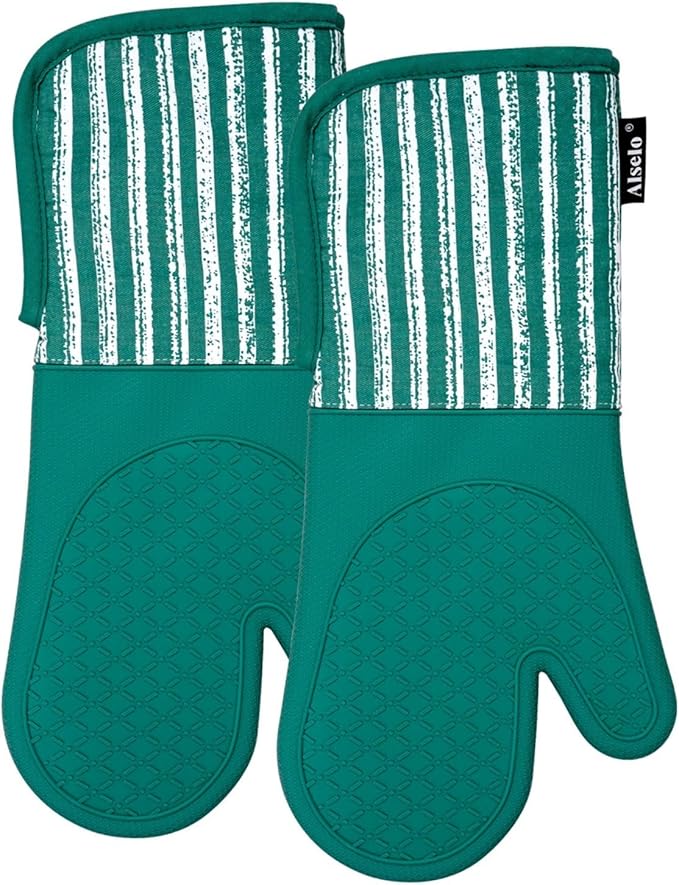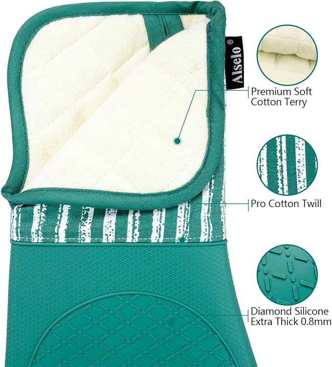About This 1.EXTRA-LONG LENGTH WITH UNIQUE DESIGN: Alselo kitchen oven mitts with 15-inch length, are widely used for cooking, barbecue,... Read more