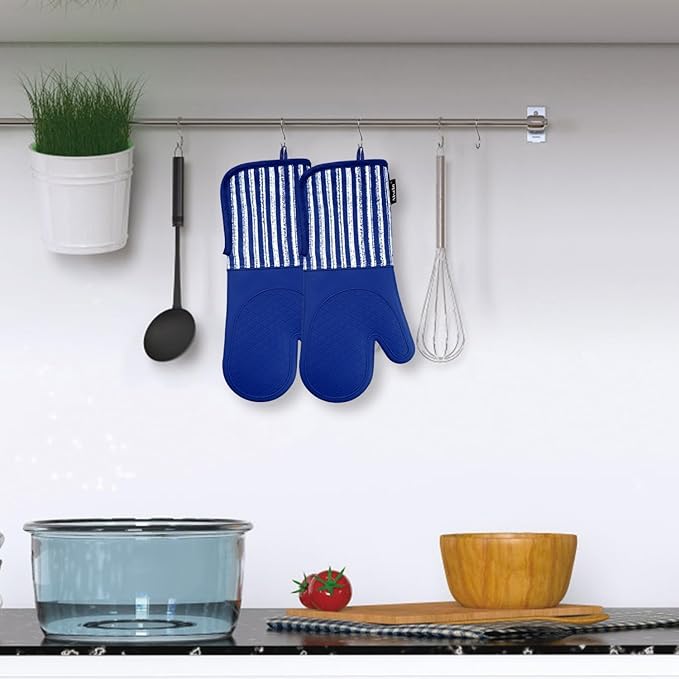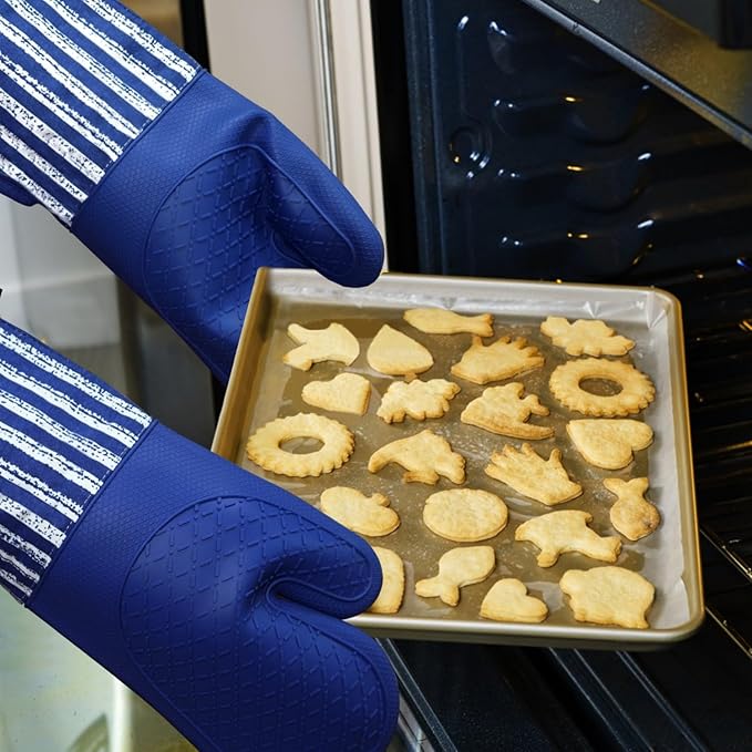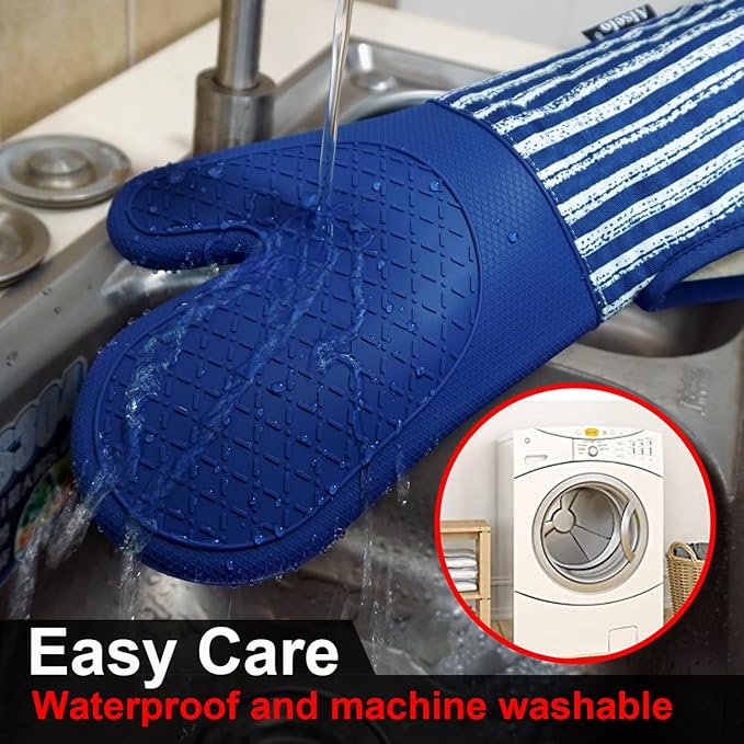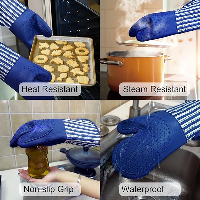 Silicone Oven Mitts Heat Resistant 932℉ with Waterproof & Non-Slip Kitchen Mittens, Set of 2 Extra Long Oven Gloves with Soft Cotton Terry Lining for Baking Cooking Barbecue (Cobait Blue, 2)