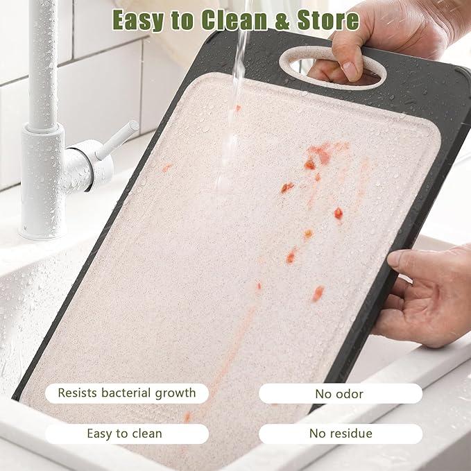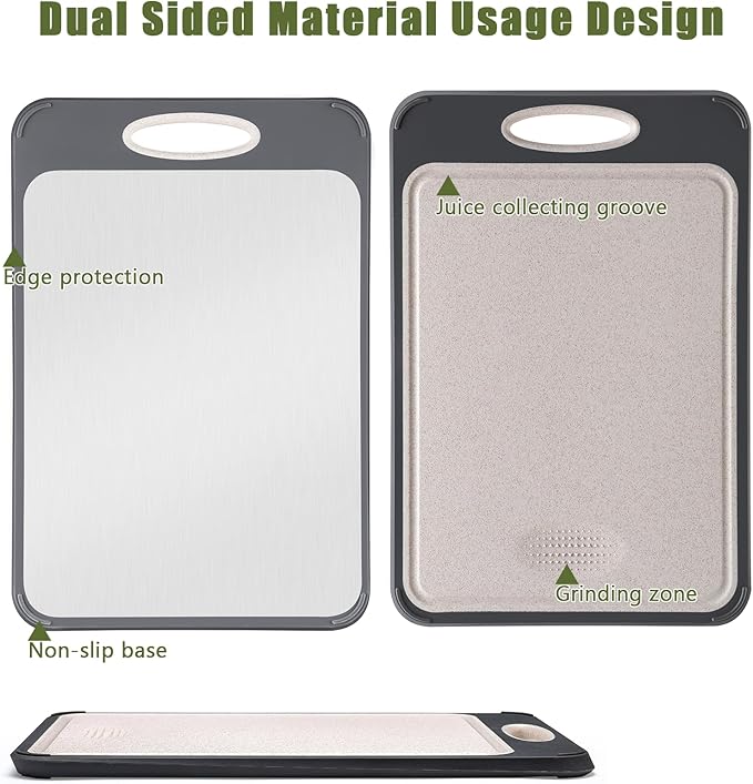 About This 【DESIGNED FOR EVERYDAY KITCHEN USE】 This dual-sided cutting board combines stainless steel for meat and wheat straw PP... Read more