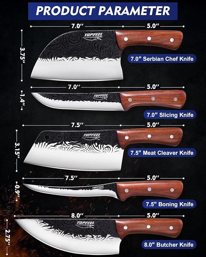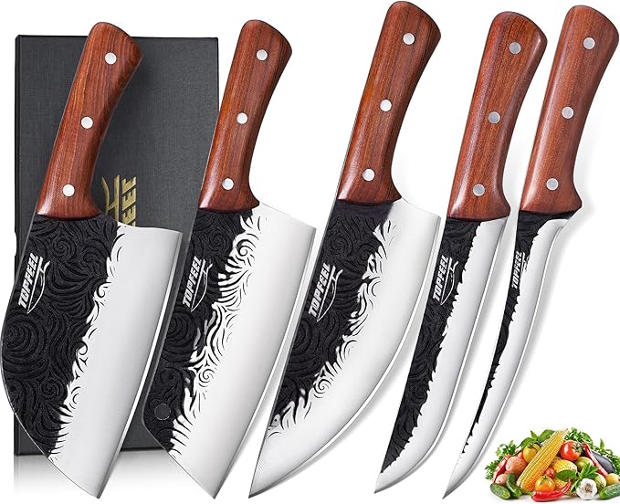 Butcher Knife Set 5PCS, Hand Forged Kitchen Knives Set Serbian Chef Knife Set, Meat Cleaver Boning Carving Knives Set for Home、Camping、BBQ