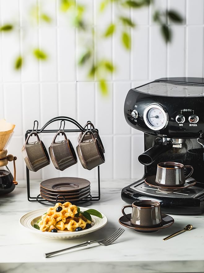 YHOSSEUN Espresso Cups 4 Oz, Porcelain Coffee Cups Set of 6 Espresso Cup with Saucers, Meatal Stand, and Stir Spoons, Brown Expresso Shots Cup