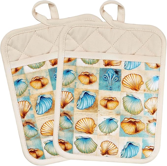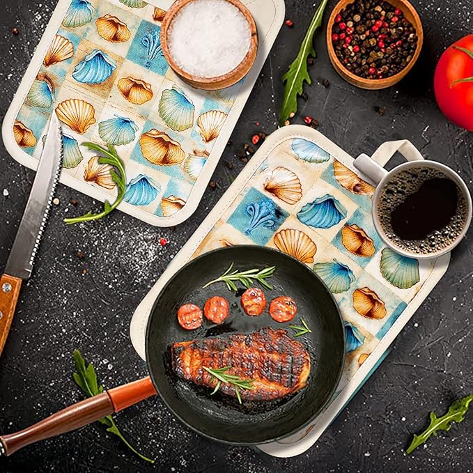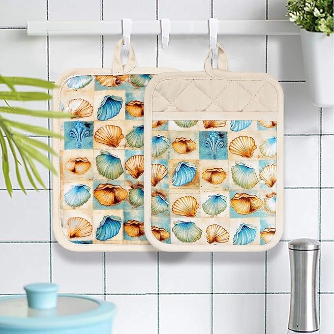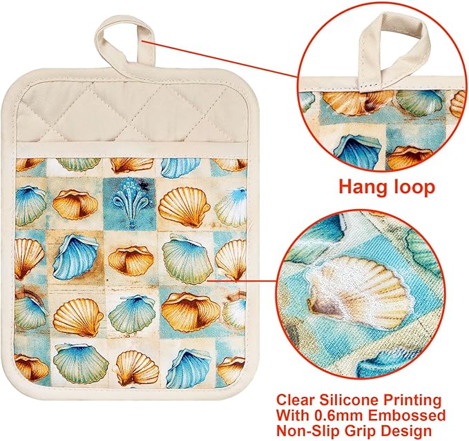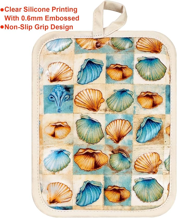 Pot Holders Set of 2 Heat Resistant 480 ℉Non Slip Clear Silicone Printed Comfortable Cotton Lining Kitchen Women Men Cooking Baking Microwave Machine Washable (Shell, Beige potholders)