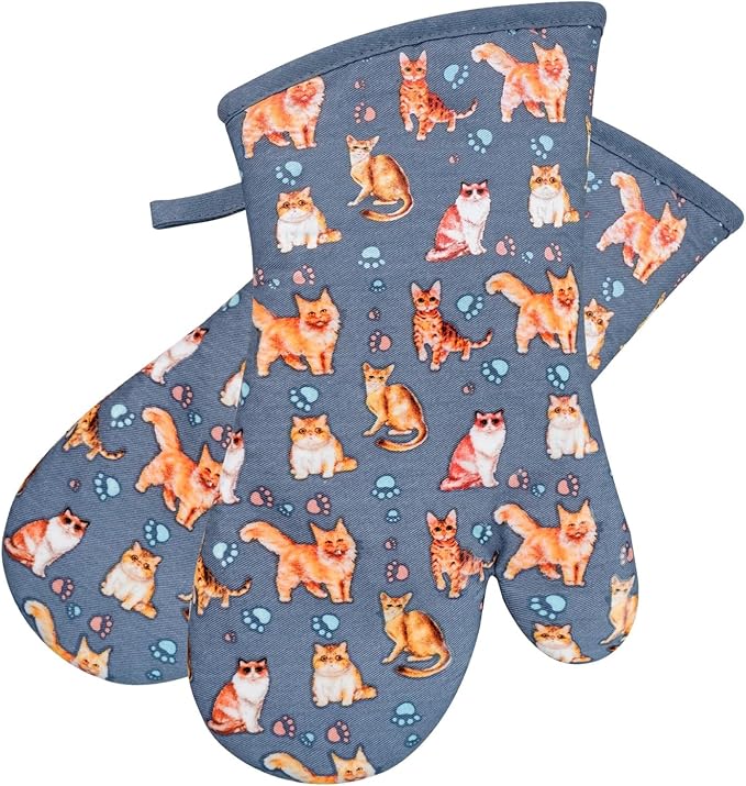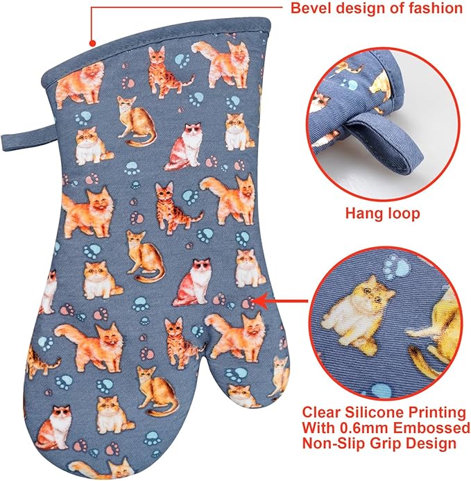 Oven Mitts Gloves 1 Pair Heat Resistant 480 ℉ Non Slip Clear Silicone Printed Cat Comfortable Cotton Lining Kitchen Men Cooking Barbecue Machine Washable (Cat, Blue Mitts)
