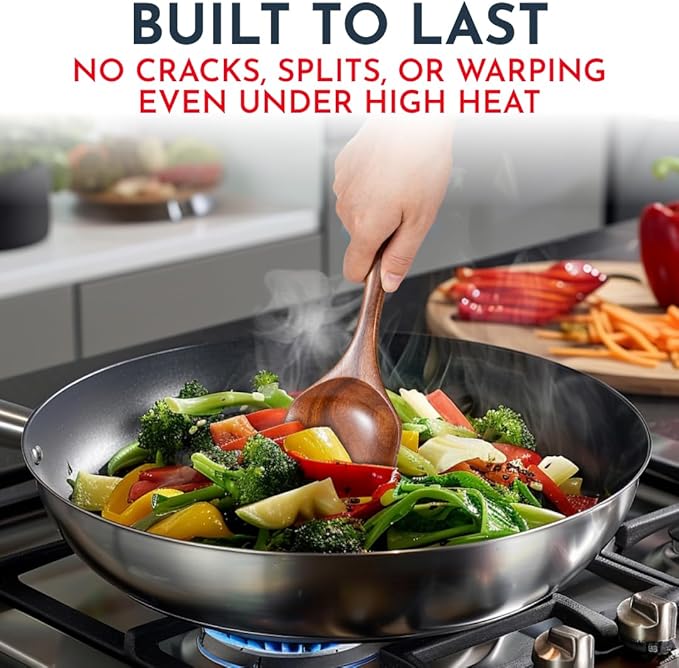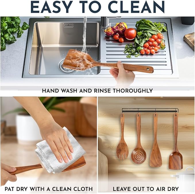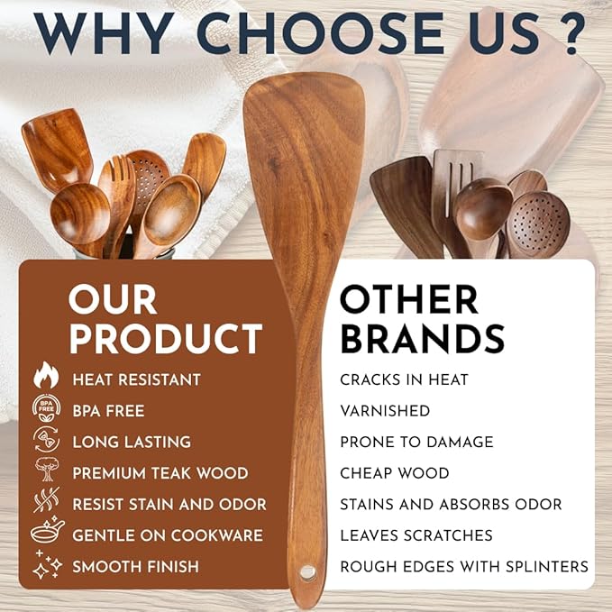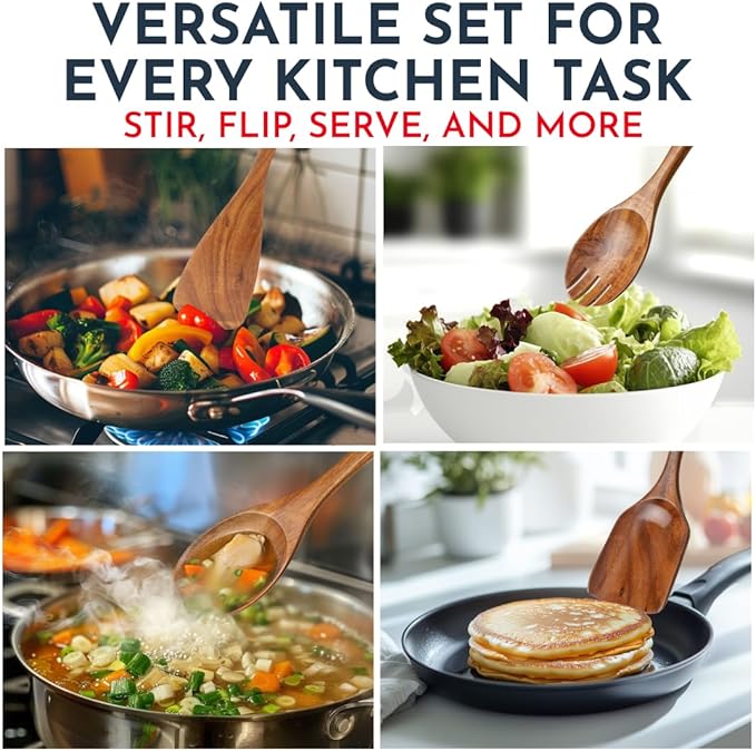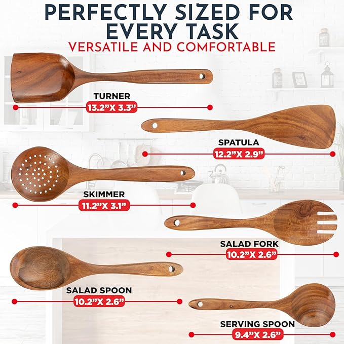 Teak Wooden Utensil Set 6-Piece - Smooth Finish Wooden Spoons for Cooking - Comfortable Grip, Non Scratch Premium Kitchen Wooden Cooking Utensils Set Teak Wood Cooking Utensils