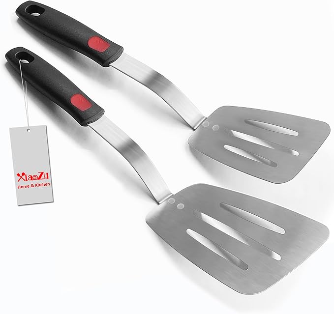 Stainless Steel Flexible Spatula Slotted Turner, XiaoZu Thin Metal Spatula for Cast Iron Skillet, Thin Blade and Heat Resistant Silicone Handle, Great for Egg, Cookie, Meat, Crep, Medium + Large