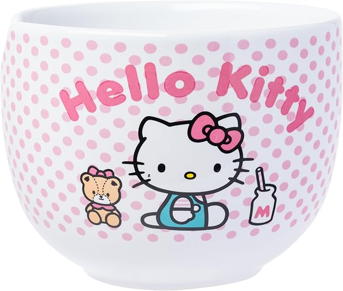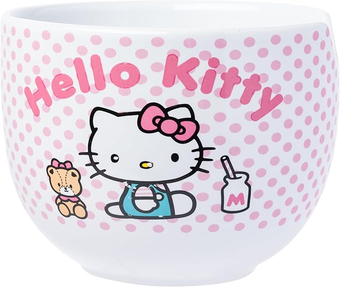 About This SANRIO HELLO KITTY: This adorable Sanrio Hello Kitty ceramic bowl features Hello Kitty surrounded by a milk bottle... Read more