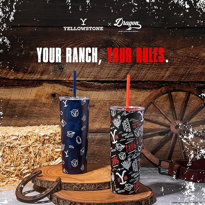 Dragon Glassware x Yellowstone Vacuum Insulated Tumbler with Lid and Straw - 24 oz Tumbler Cup with 2 Straws - Stainless Steel Tumbler with Straw for Water, Iced Tea - 1886