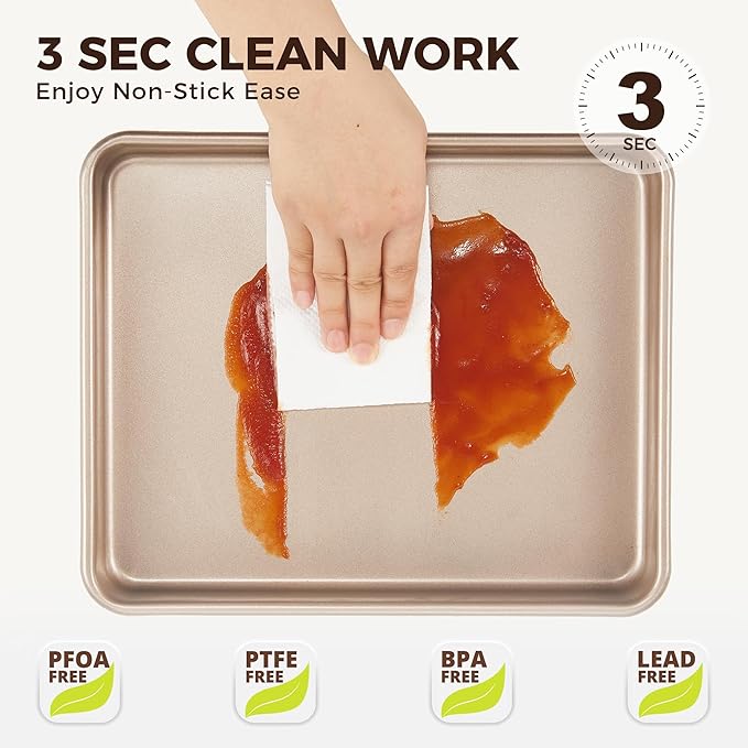 HONGBAKE 2 Pack 11 x 9 Inch Toaster Oven Pans and Trays, Small Baking Sheet Set for Cooking, Non-Stick Cookie Sheets, Heavy-Duty 0.8mm Thick, Easy to Clean, 1.26 Inch Deep, Gold