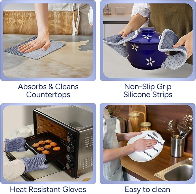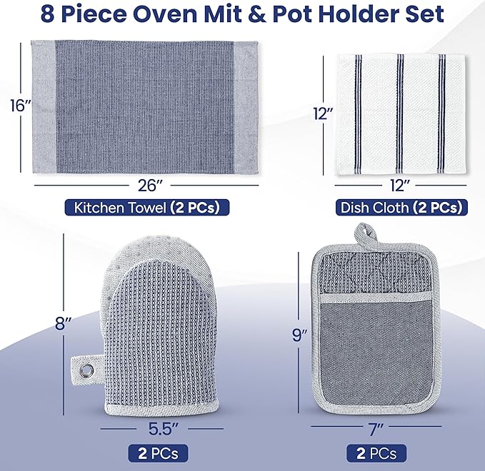 Casa Platino Mini Oven Mitts Set, 8-Piece – 500°F Heat Resistant Silicone Oven Mitts, Potholders for Kitchens, 2 Kitchen Towels & 2 Dish Cloths – Non-Slip & Durable – Indigo