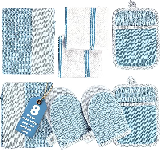 Casa Platino Silicone Oven Mitts Set, 8-Piece – 500°F Heat Resistant Mini Oven Mitt Set, Potholders for Kitchens, 2 Kitchen Towels & 2 Dish Cloths – Durable, Non-Slip & Machine Washable – Cornflower