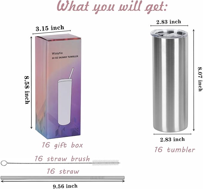 16 Pack 20 Oz Straight Skinny Tumblers,Individually Gift Boxed Stainless Steel Slim Skinny Tumbler Set Bulk, 20 Oz Insulated Slim Thin Travel Tumbler Cup for Diy, Silver